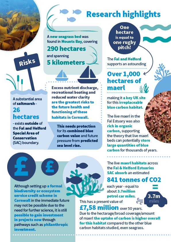 Baselining: Surveys and analysis helped us understand the amount of carbon stored within kelp, maerl, saltmarsh and seagrass in two important Cornish coastal locations - Fal and Helford Estuary, and Mounts Bay.