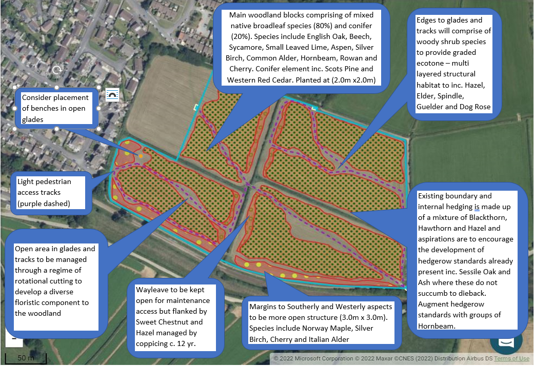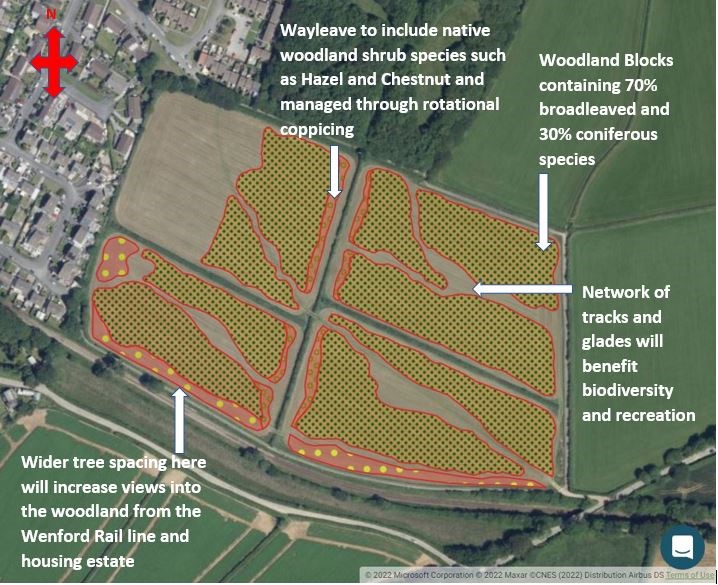 Design of the new woodland aims to allow for approximately 20 % open space in the form of tracks and open glades to maximise potential habitat for a wide range of wildlife. The aim is to plant a diverse range of trees, including native species such as Beech, Oak, Small Leaved Lime, Birch, Alder, Wild Cherry, Hazel and a small component of coniferous species.