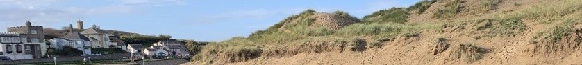 - Erosion and exposed rock armour along the seaward edge of the dunes