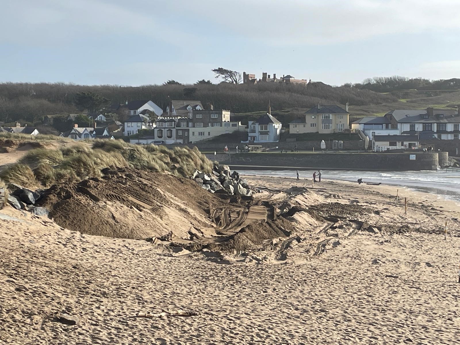 During this time, machinery will be used to move sand which has blown onto car parking spaces and will be moved through the beach access way to the south of RNLI building. It will then be relocated onto the rock armour (large boulders) which are on the seaward side of the dune. The contractor will work from north to south - placing sand close to the northern access route first, and working southwards along the line of rock armour.
