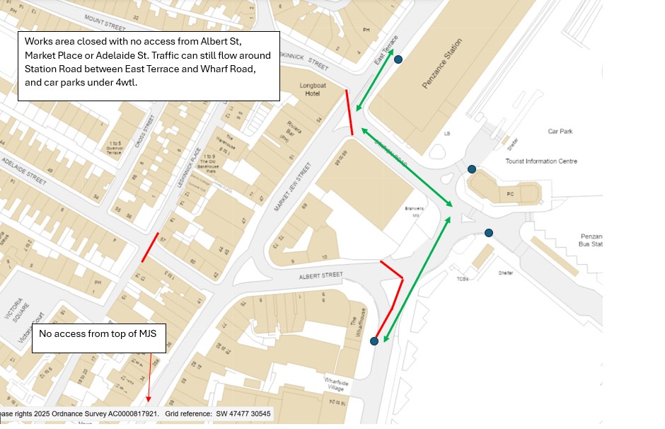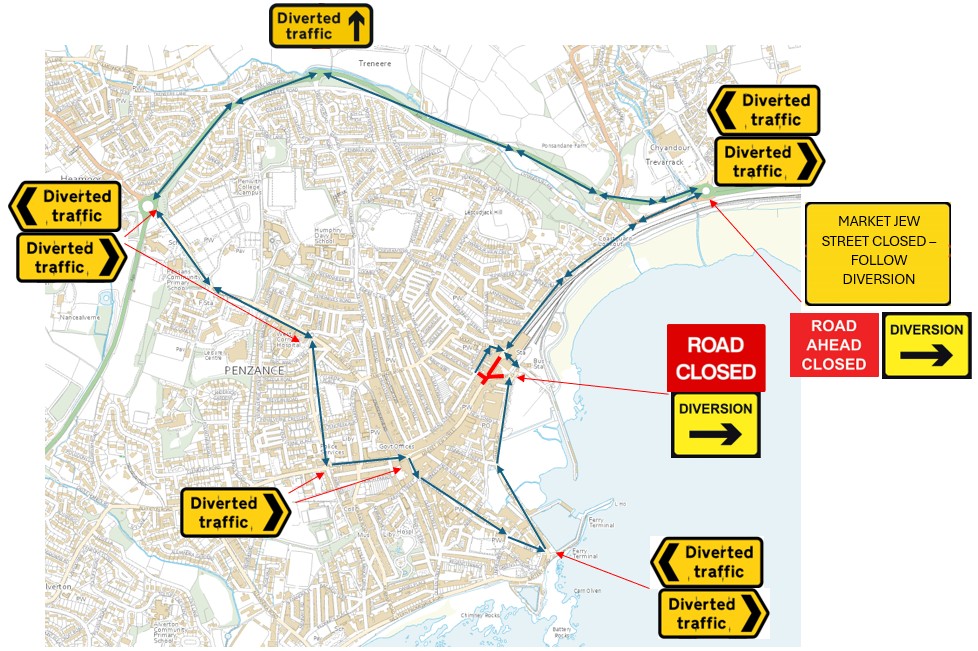 - From 22 September – 20 October, a road closure will be in place on Station Road, Market Jew Street, Leskinnick Street and East Terrace.