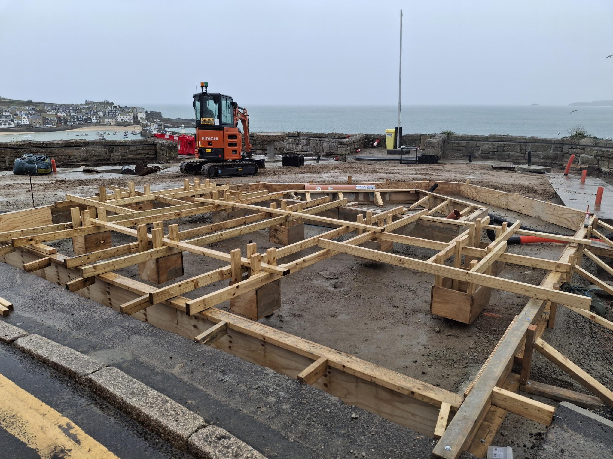 Despite the challenging weather over the past week, work is progressing well on pouring the concrete for the foundations of the new benches.