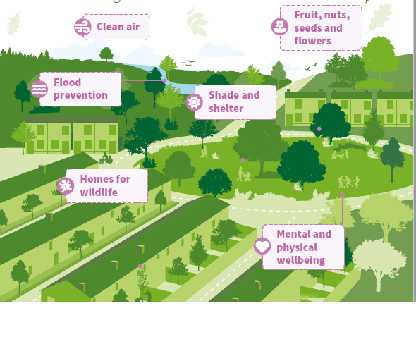 Urban trees can help us adapt to some of the worst impacts of climate change, they absorb carbon dioxide, improve air quality, reduce surface water flooding, provide wildlife habitat and support biodiversity. We instinctively know that trees and greenery are good for our wellbeing and this was especially evident during COVID 19 when people flocked to visit parks, woodlands and open spaces, but not everyone has equal access to these places which is one of many reasons why more urban trees are needed.