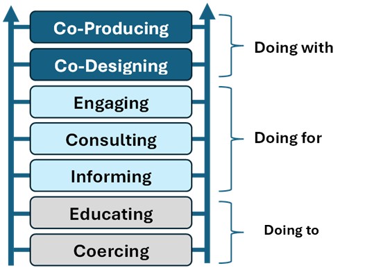| Co-designing | Residents and local groups help design council services and projects. They can influence decisions but usually don’t help deliver them. | The council runs workshops where people help design a new recycling scheme, and their ideas are included in the final plan. |